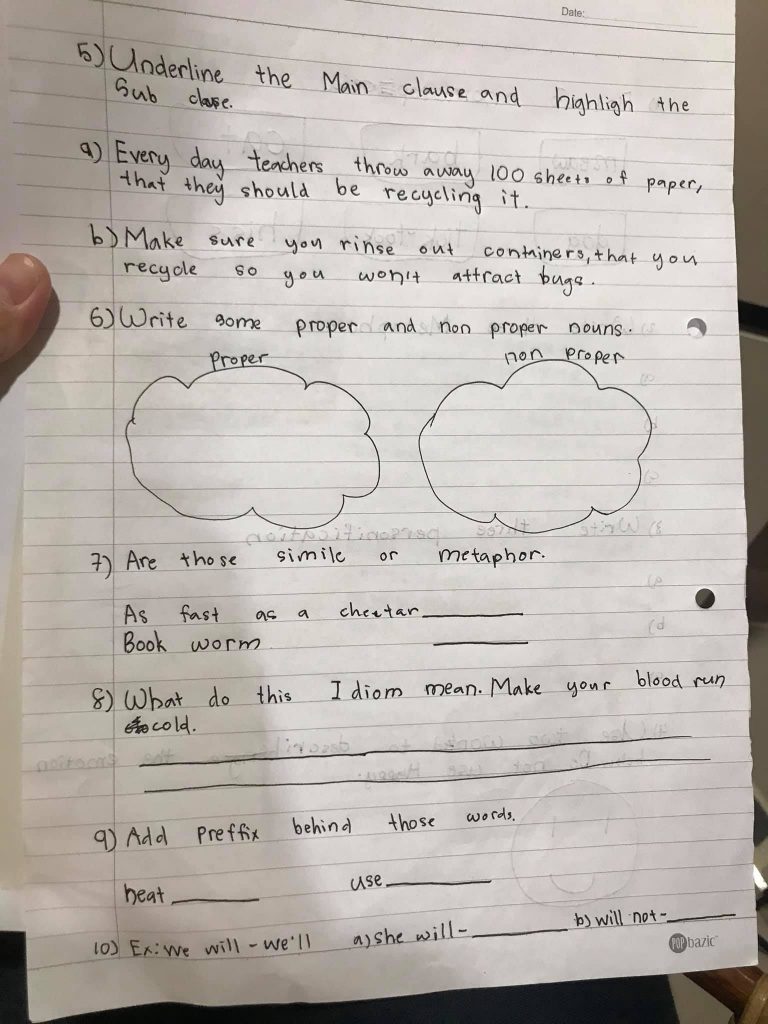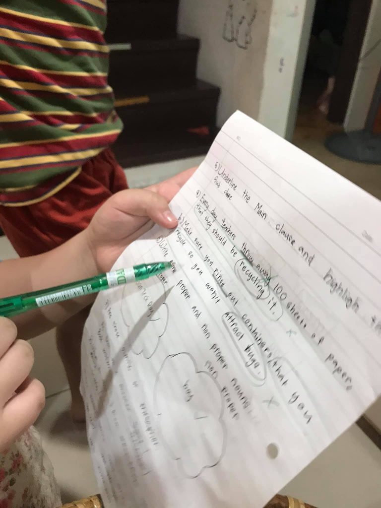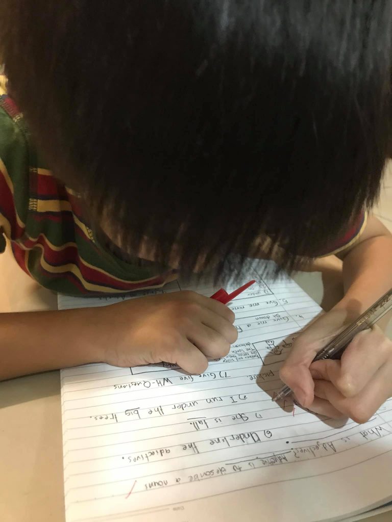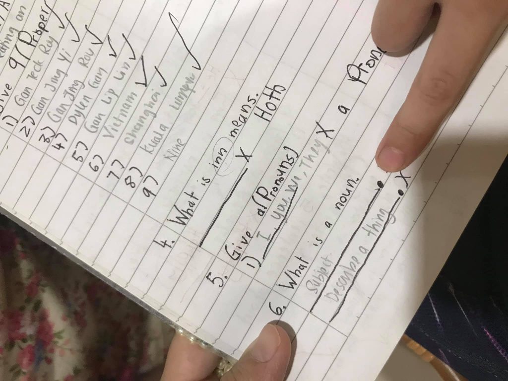 大概一小时后,大姐和哥哥都拿着他们出的考题给我做。这份考卷也挺挑战的哦,有的题目也真的很难,我也不太确定答案是什么? 但是我也得要给孩子示范,无论多么难的题目,妈妈也要不断的尝试作答,不放弃的尝试想想看,时间还有多,就重复的翻阅和检查,看看有没有遗漏的地方。妈妈终于作答完毕了,孩子们取回我作答的考卷,回房间去批改了。批改完步后,他们还会来给我每一题的解释,为什么我答错了,为我解释正确的答案是什么。 哥哥还扣了我的两份“粗心大意”分数。哥哥说: “这题你忘了句号, 扣一分”。 “这题问题是自需要一个正确的答案,你填了两个,没看清楚题目,扣一分”。